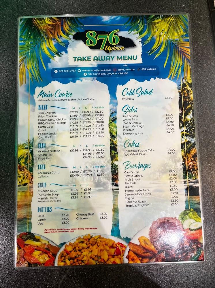 Located at 38A S End in Croydon, 876 Uptown stands as a welcoming beacon for Halal Jamaican cuisine. The restaurant embodies a lively Caribbean spirit that captures both locals and visitors. Paying homage to Jamaican culinary traditions, each dish is a blend of bold flavors and comforting aromas. Diners enjoy a friendly vibe that extends from the food to the service, where every staff member greets you like family. The restaurant provides ample options for lunch and dinner, making it a go-to spot for both quick bites and leisurely meals. The space accommodates families, groups, and individuals from all backgrounds, creating a community hub that celebrates diversity. With convenient parking options nearby and accessible amenities like restrooms, 876 Uptown ensures every guest feels at home.